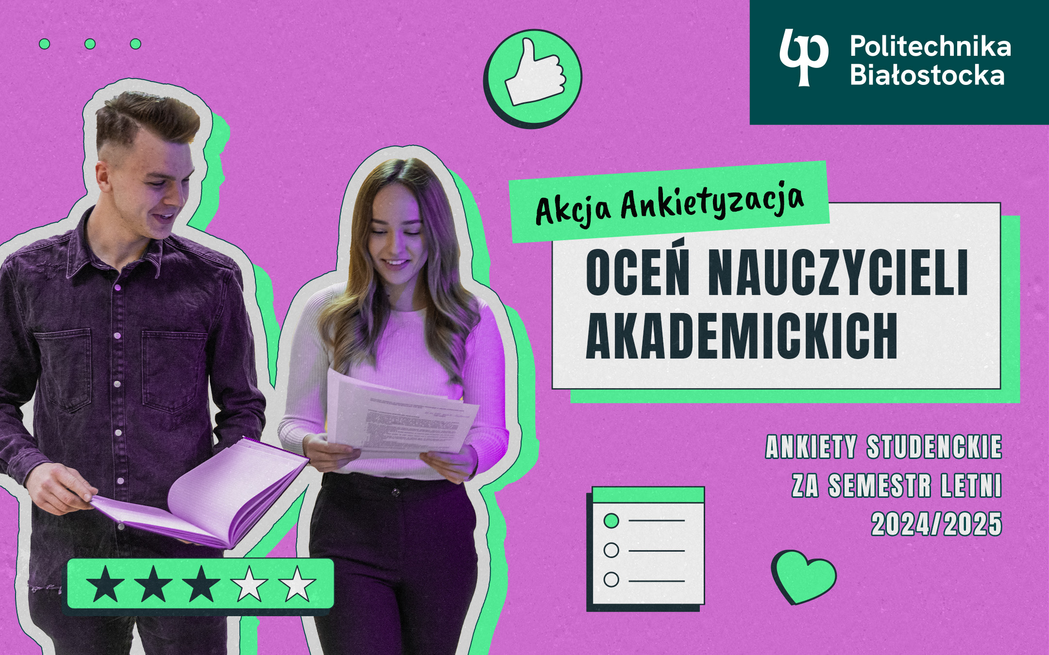 Ankiety studenckie to okazja, aby poznać Waszą – Studentów opinię na temat pracy wykładowców. Dzięki temu nauczyciele akademiccy dostaną feed back na temat prowadzonych przez nich zajęć, dowiadując się na co zwracacie uwagę i co warto zmienić. Akcja odbywa się w dniach 16-18 czerwca 2025 na każdym z wydziałów. Prowadzi ją Samorząd Studentów Politechniki Białostockiej.