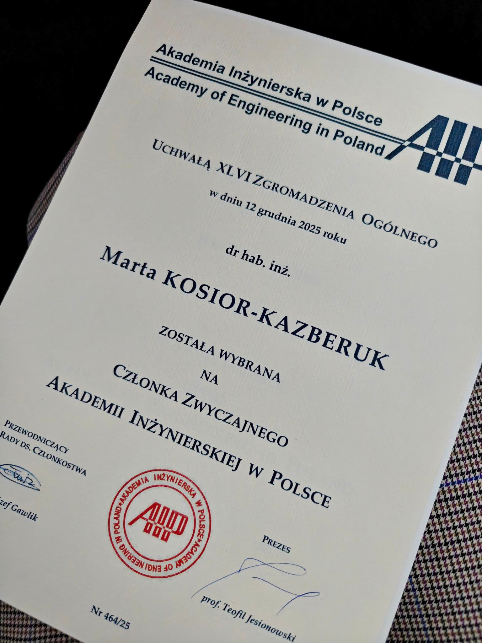 Uroczyste przyjęcie w poczet członków AIP miało miejsce podczas 46. Zgromadzenia Ogólnego, zorganizowanego w dniach 11–12 grudnia 2025 r. na Politechnice Lubelskiej.