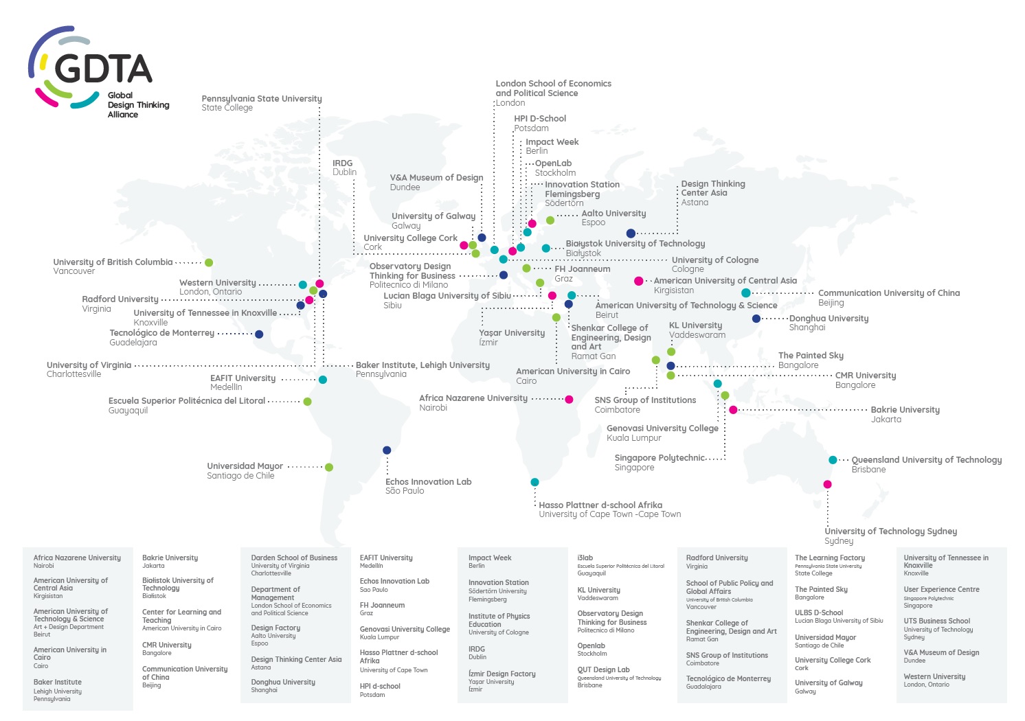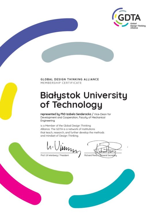 Global Design Thinking Alliance to elitarna sieć 39 instytucji z 24 krajów (m.in. z USA, Niemiec czy RPA), które redefiniują sposób tworzenia innowacji. Skupiają się na ustanawianiu wysokich międzynarodowych standardów w nauczaniu i badaniach w dziedzinie Design Thinking – myśleniu projektowym. Członkostwo Politechniki Białostockiej w sieci GDTA to zarazem wyróżnienie oraz potwierdzenie, że nasze podejście do edukacji i projektowania zorientowanego na człowieka (human-centered design) spełnia najwyższe światowe standardy.