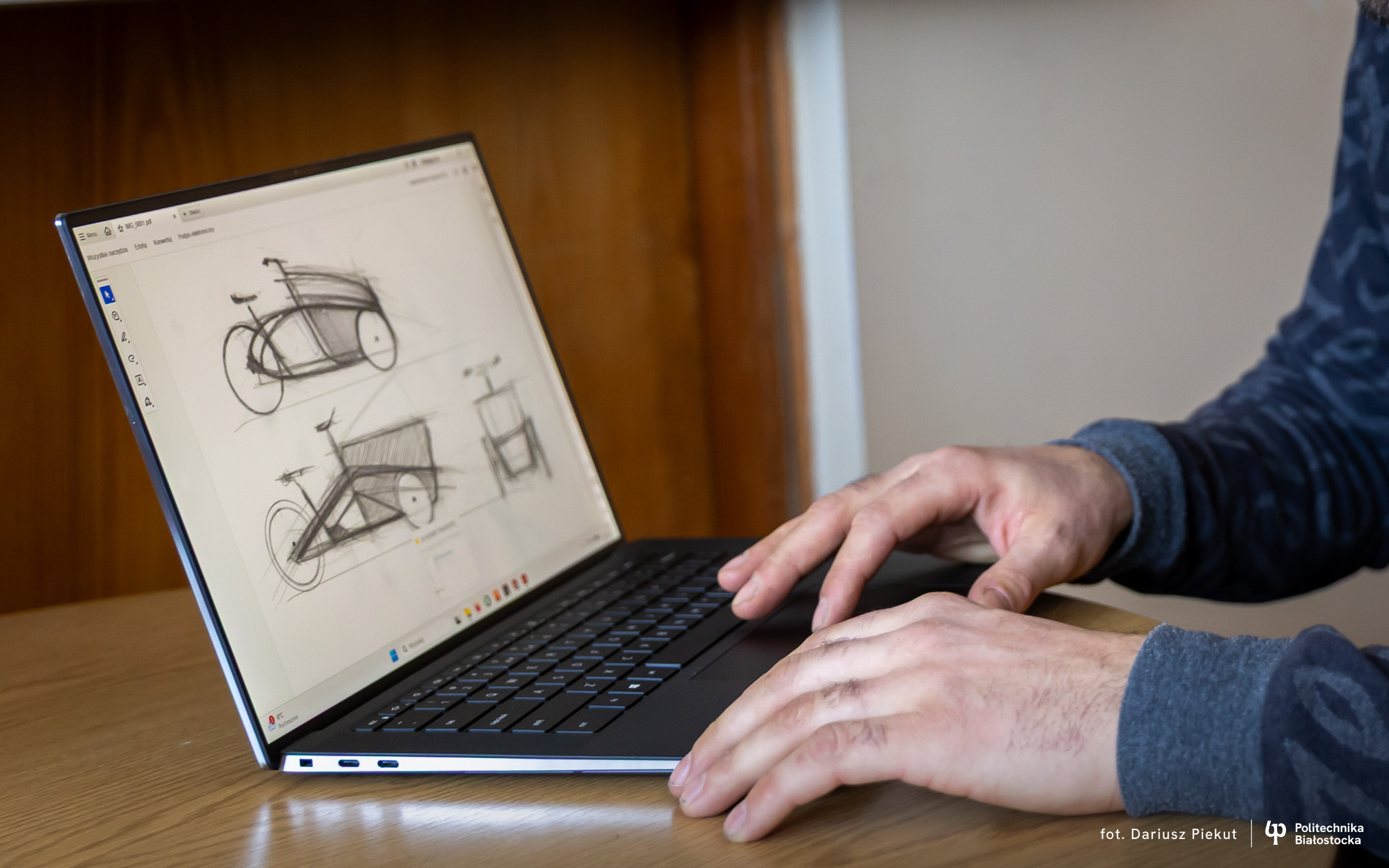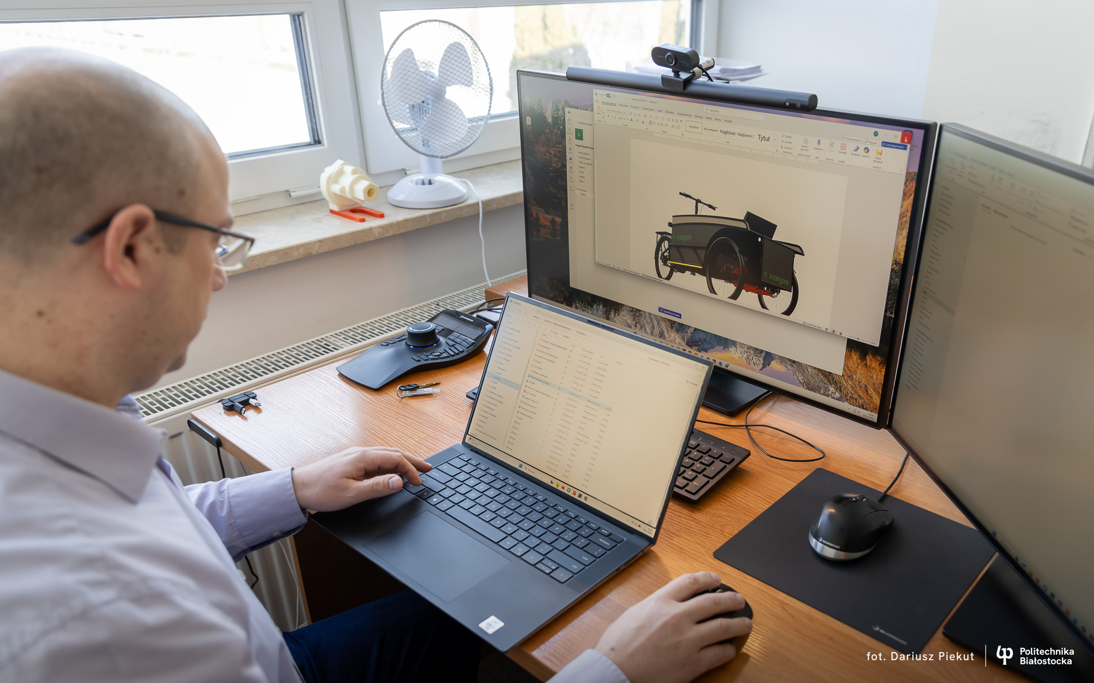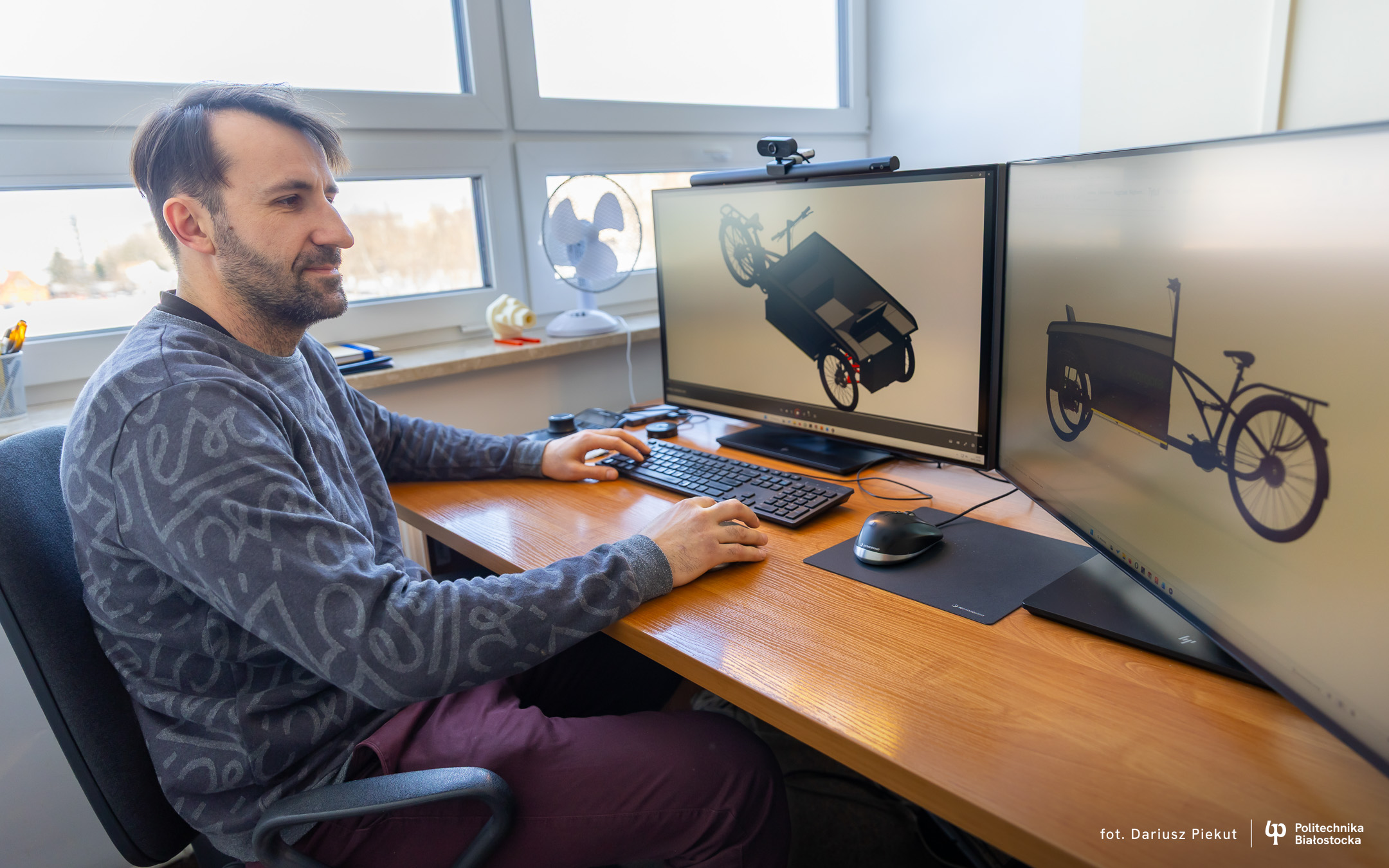 – Naszym zadaniem było przygotowanie projektu koncepcyjnego roweru typu cargo – opowiada dr hab. inż. Paweł Dzienis, adiunkt z Katedry Techniki Cieplnej Wydziału Mechanicznego Politechniki Białostockiej. – Największym wyzwaniem było zapewnienie dosyć małego promienia skrętu, żeby ten rower był zwrotny w warunkach miejskich. Stąd odpowiednio zostało przygotowane przednie zawieszenie tego roweru. A dzięki możliwości zmiany geometrii położenia kół, uzyskujemy w miarę optymalny promień skrętu.