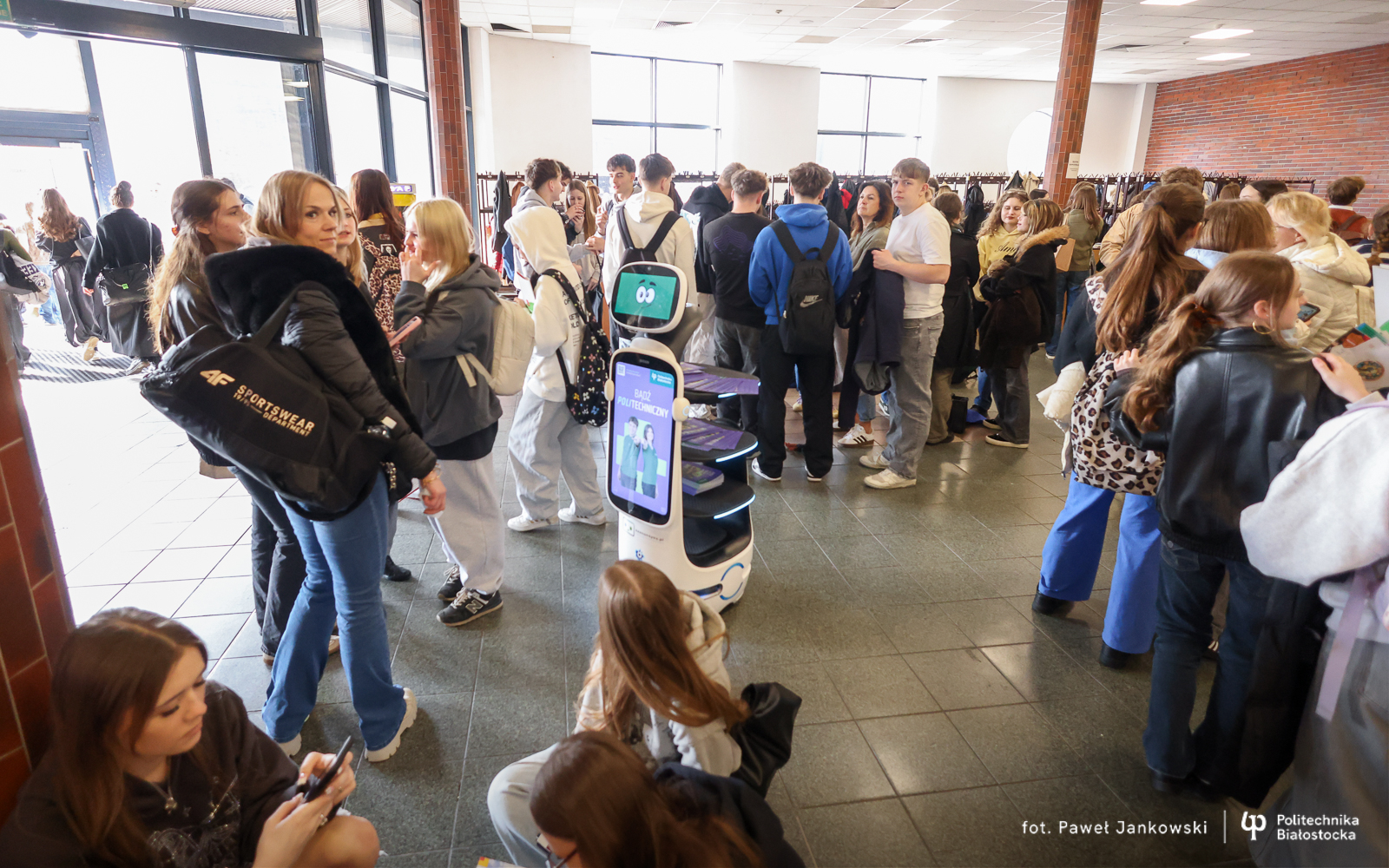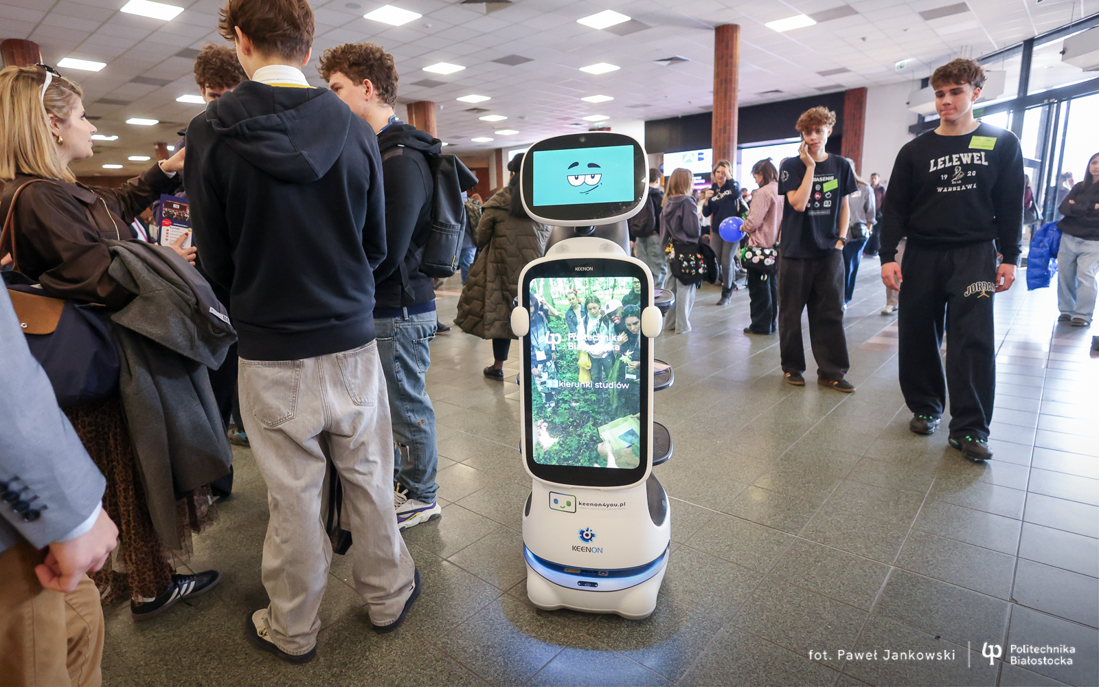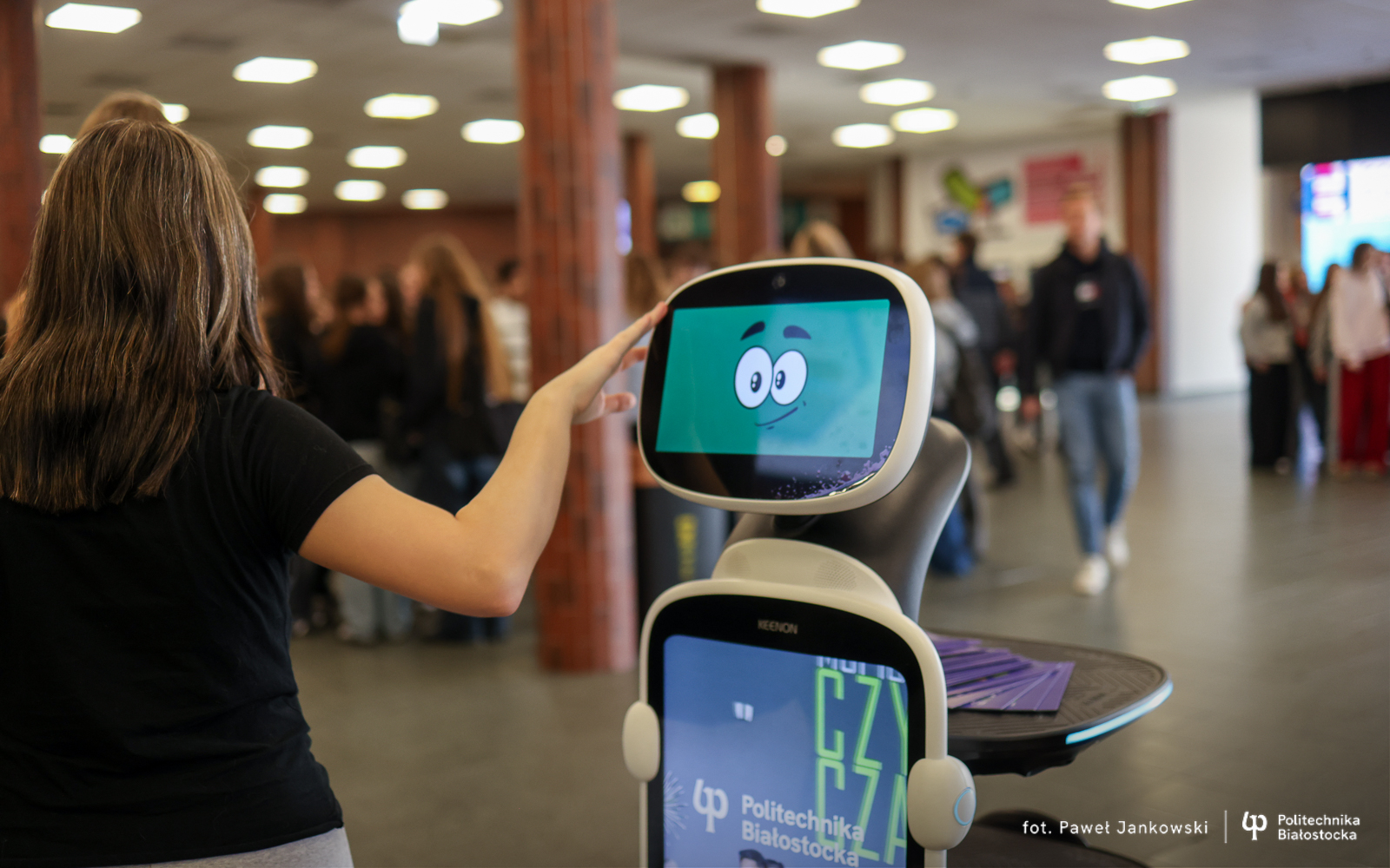 Politechnika Białostocka promuje studia z technologicznym zacięciem! Do promocyjnego teamu Uczelni w Warszawie dołączył… robot! To nowość! Interaktywny robot rozdaje materiały promocyjne, wyświetla na module TV – filmy wizerunkowe uczelni oraz prezentuje zdjęcia. Uczestnicy targów mogą za jednym kliknięciem przenieść się do serwisu internetowego Uczelni, poznając pełną ofertę kierunków dzięki kodowi QR, znajdującemu się na grafice robota, który podbija serca młodych ludzi.