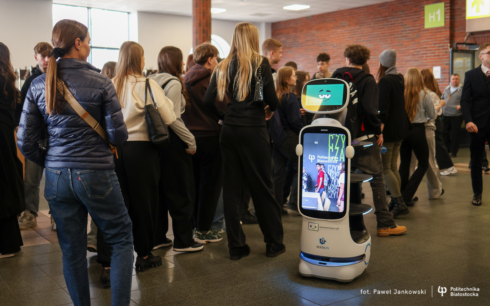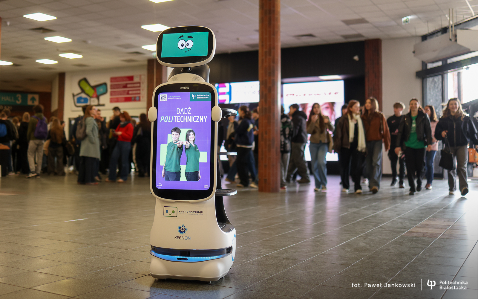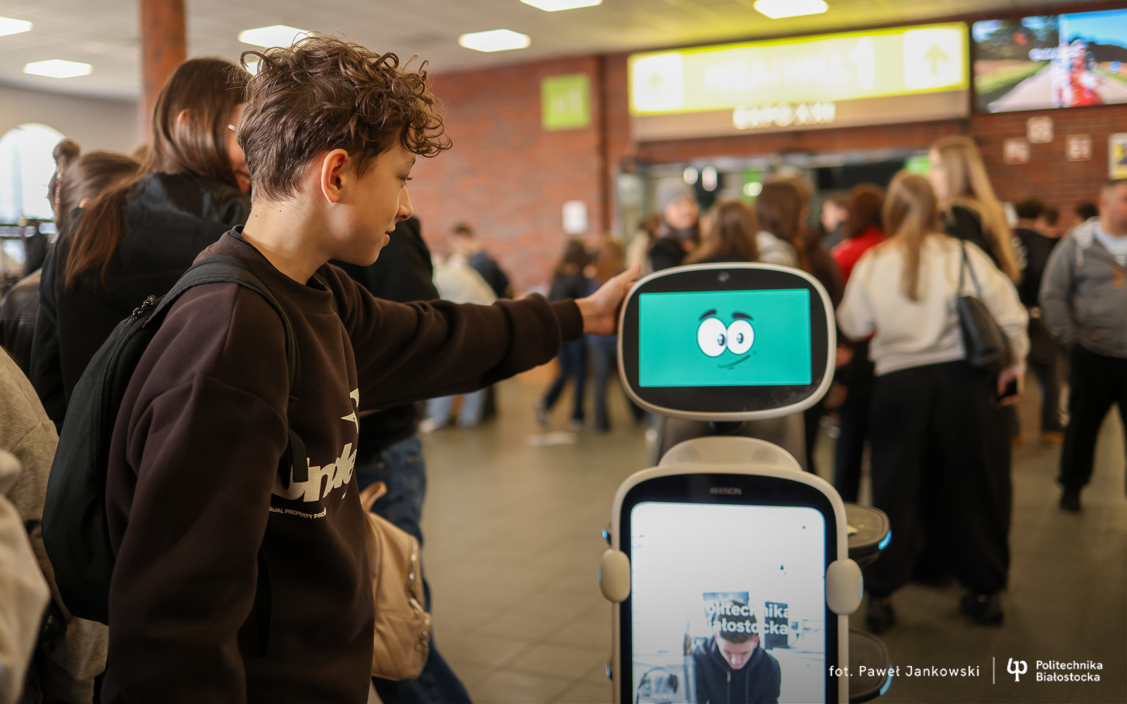 Politechnika Białostocka promuje studia z technologicznym zacięciem! Do promocyjnego teamu Uczelni w Warszawie dołączył… robot! To nowość! Interaktywny robot rozdaje materiały promocyjne, wyświetla na module TV – filmy wizerunkowe uczelni oraz prezentuje zdjęcia. Uczestnicy targów mogą za jednym kliknięciem przenieść się do serwisu internetowego Uczelni, poznając pełną ofertę kierunków dzięki kodowi QR, znajdującemu się na grafice robota, który podbija serca młodych ludzi.