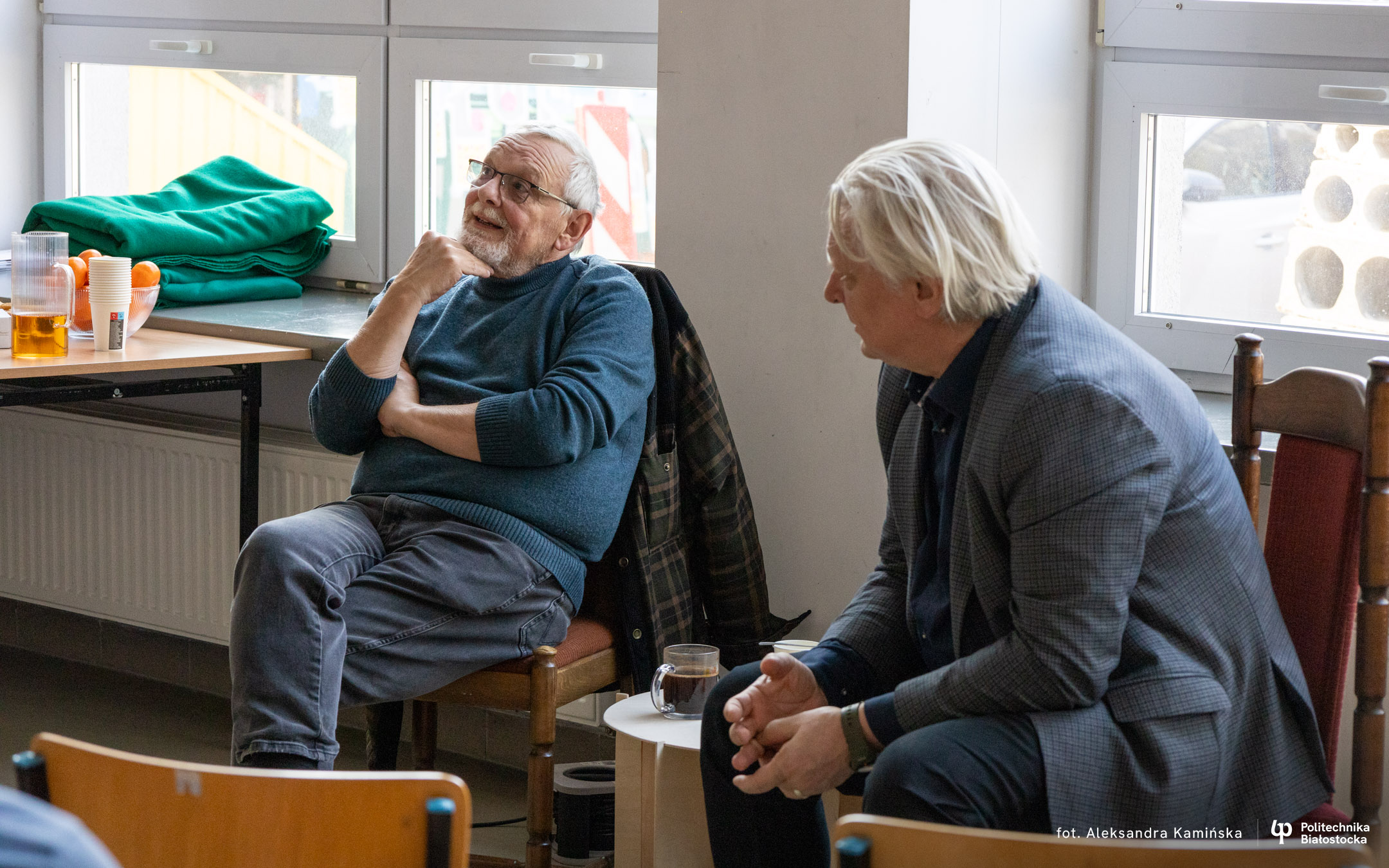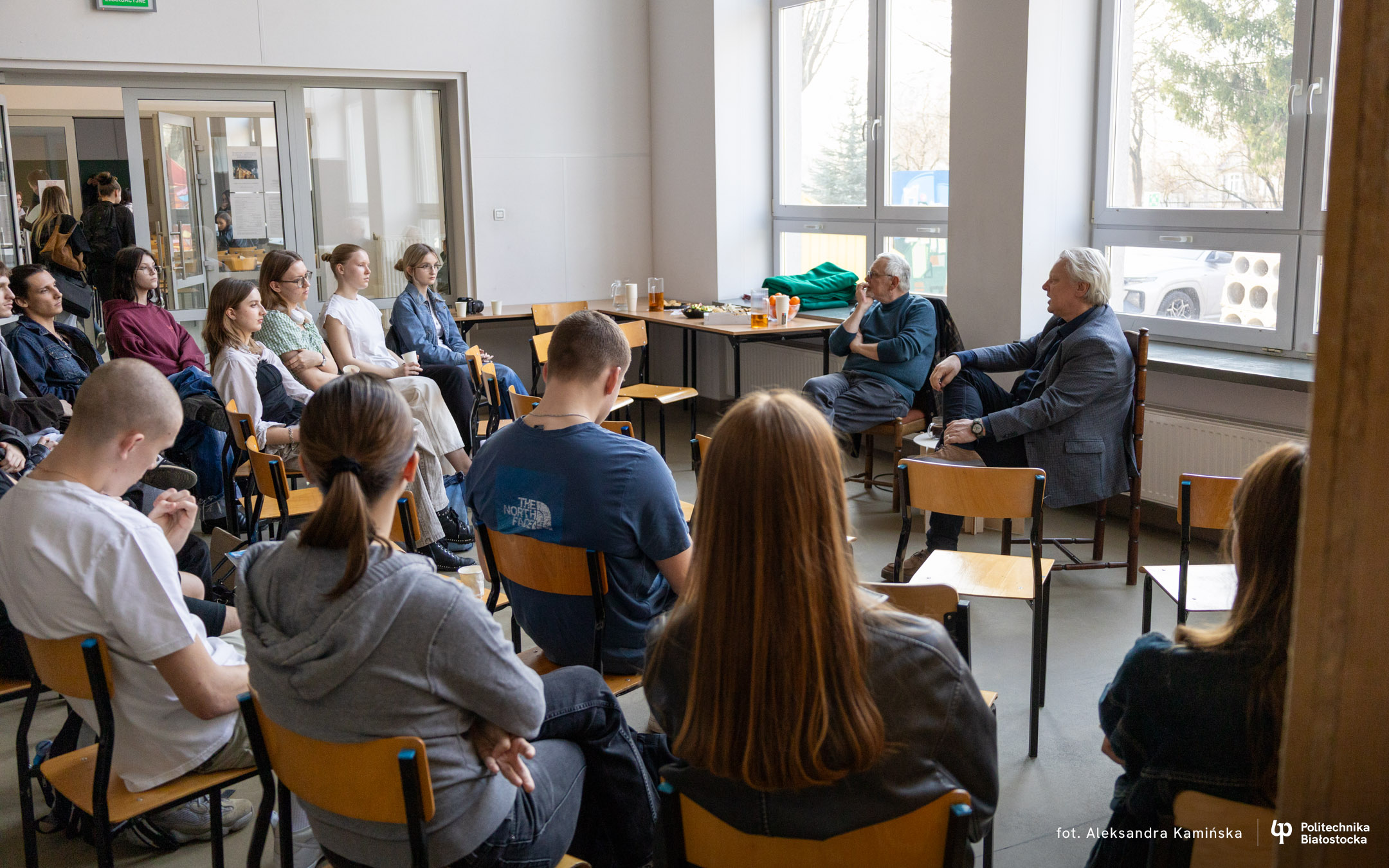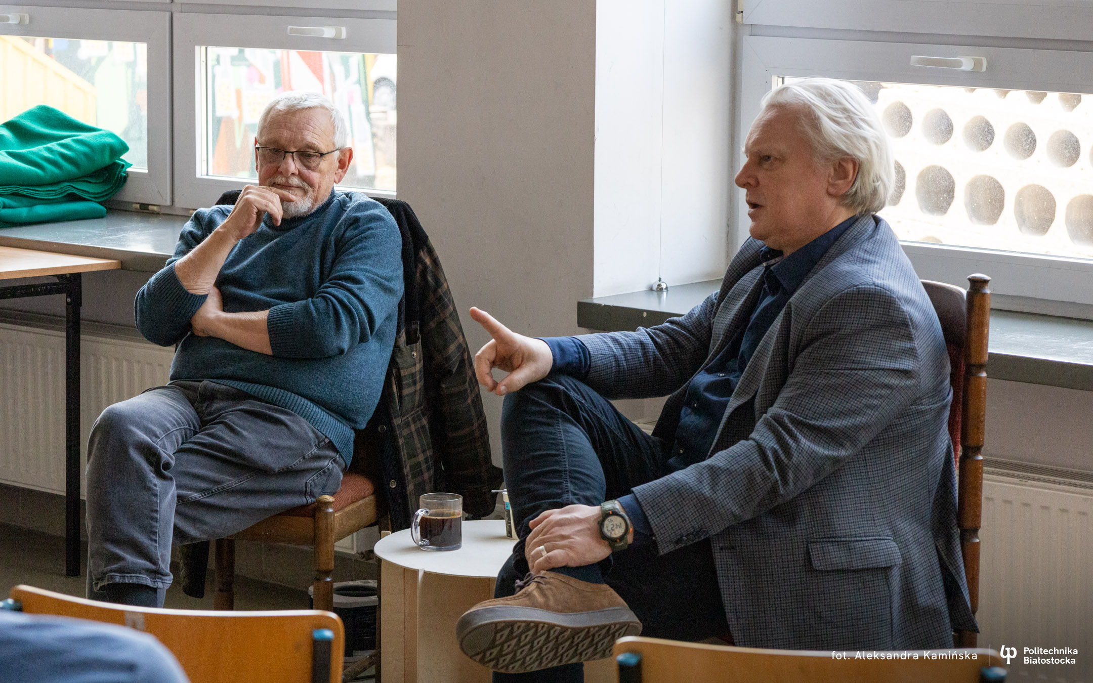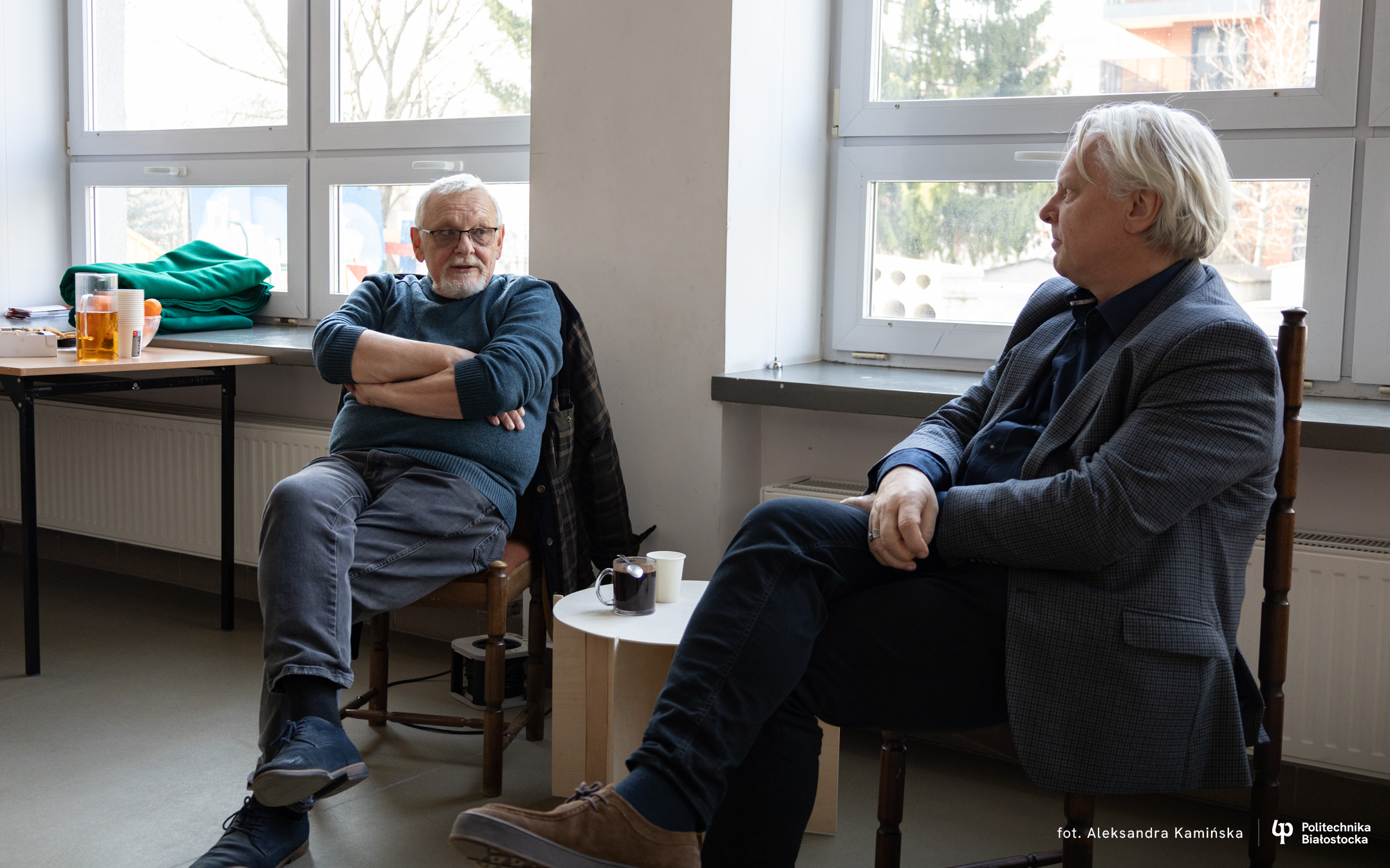 Bohaterami spotkania z cyklu „Kawka z Profesorem” byli dr inż. arch. Adam Jakimowicz oraz mgr inż. arch. Waldemar Jasiewicz. Przez ponad godzinę studenci mogli im zadawać pytania i prowokować do dzielenia się zabawnymi anegdotami.