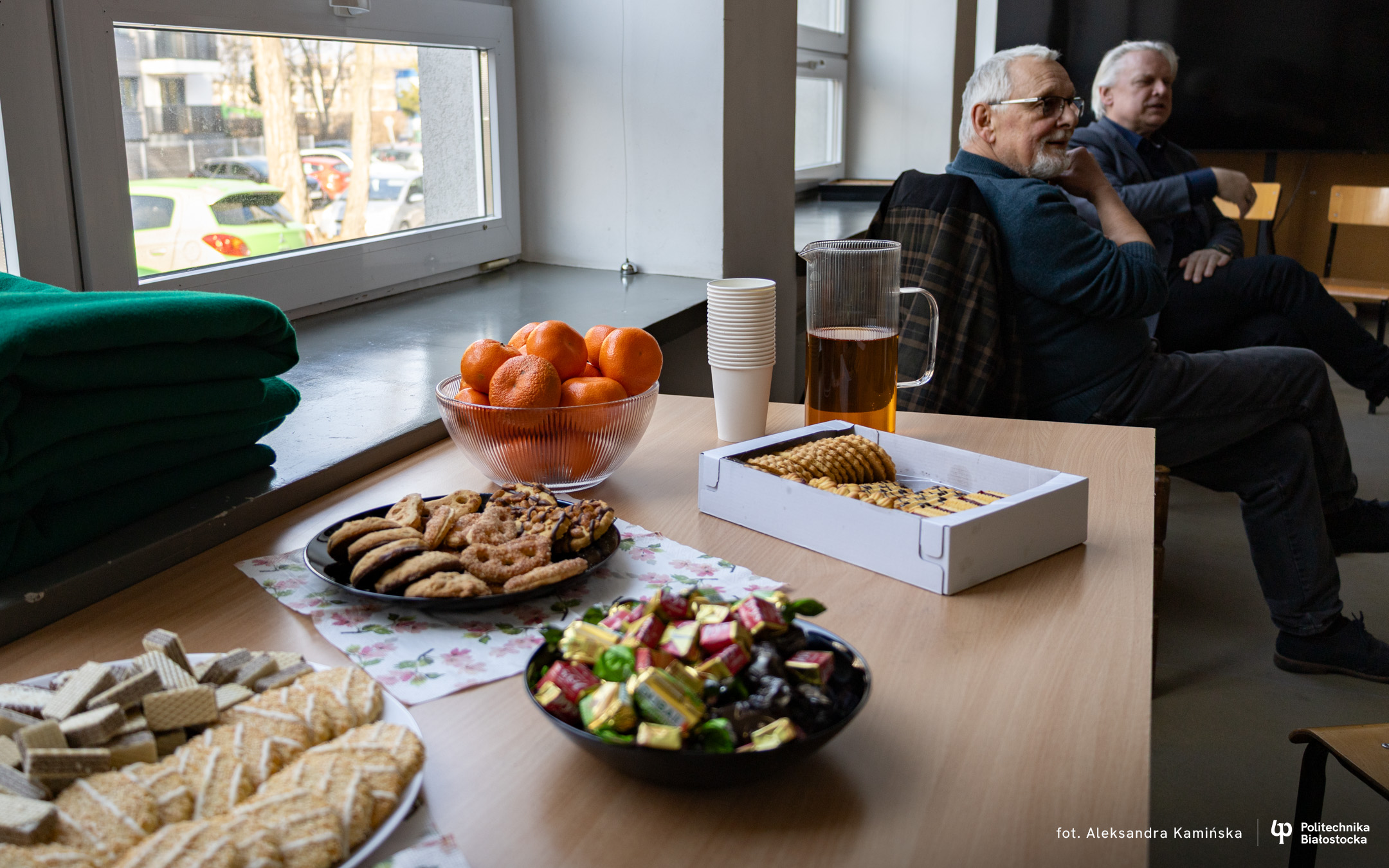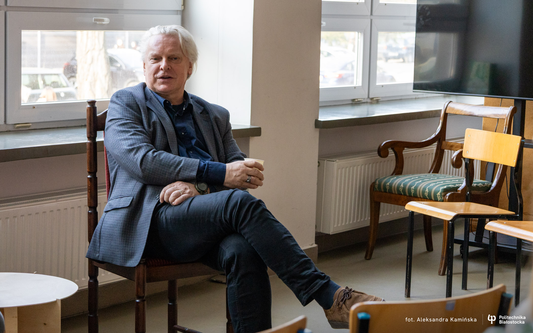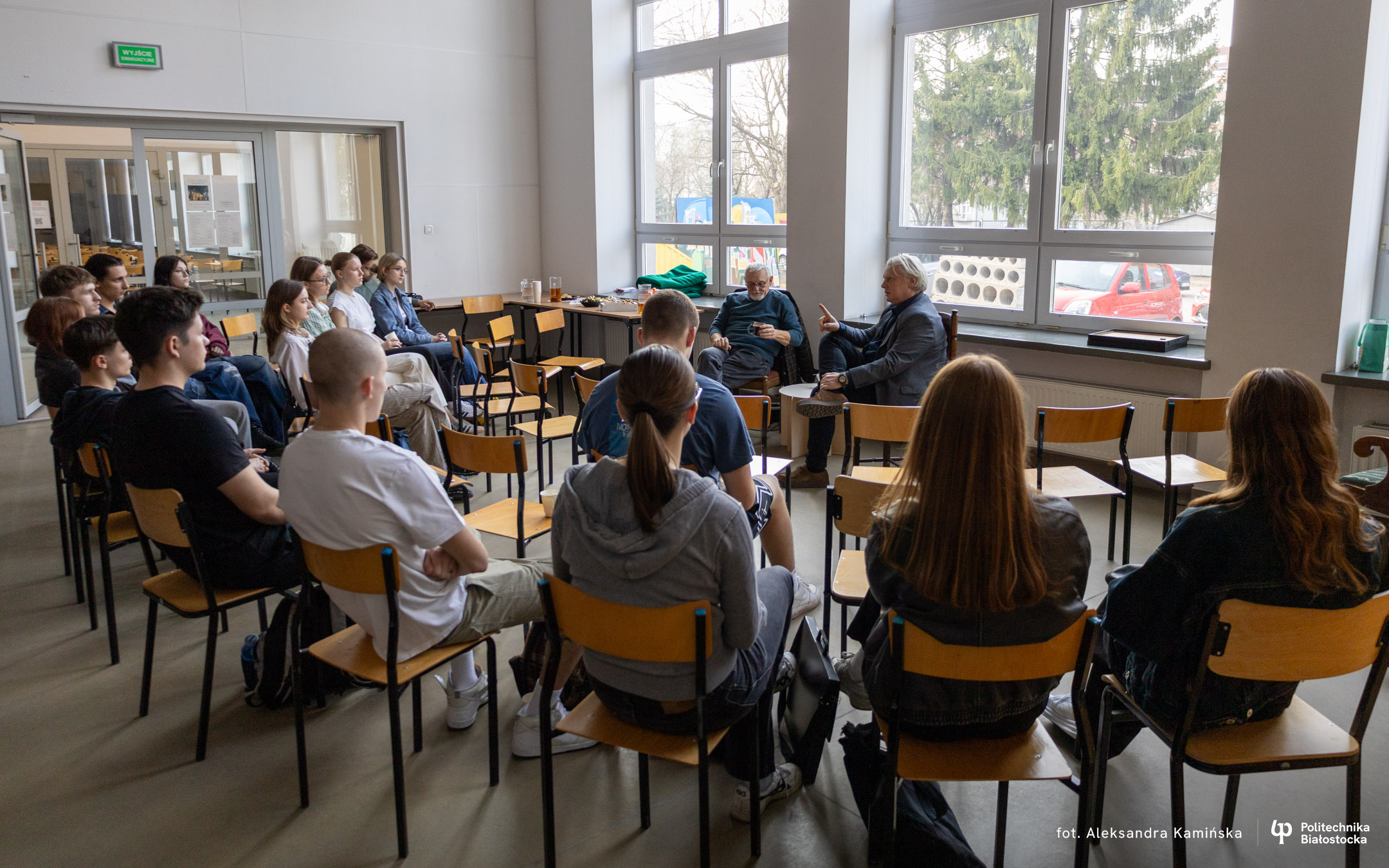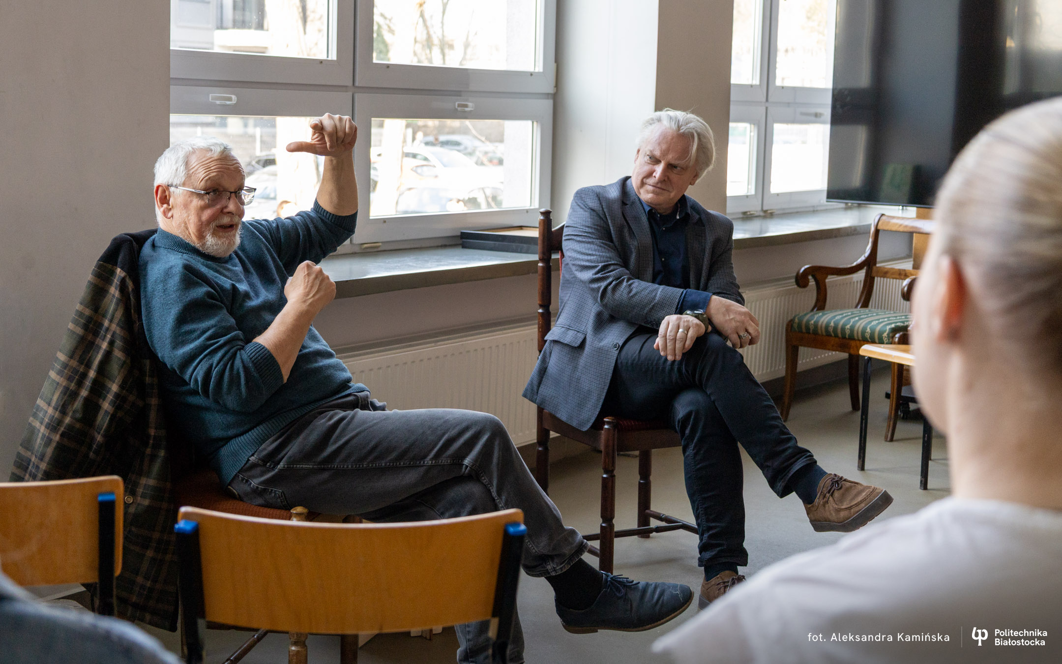 Bohaterami spotkania z cyklu „Kawka z Profesorem” byli dr inż. arch. Adam Jakimowicz oraz mgr inż. arch. Waldemar Jasiewicz. Przez ponad godzinę studenci mogli im zadawać pytania i prowokować do dzielenia się zabawnymi anegdotami.