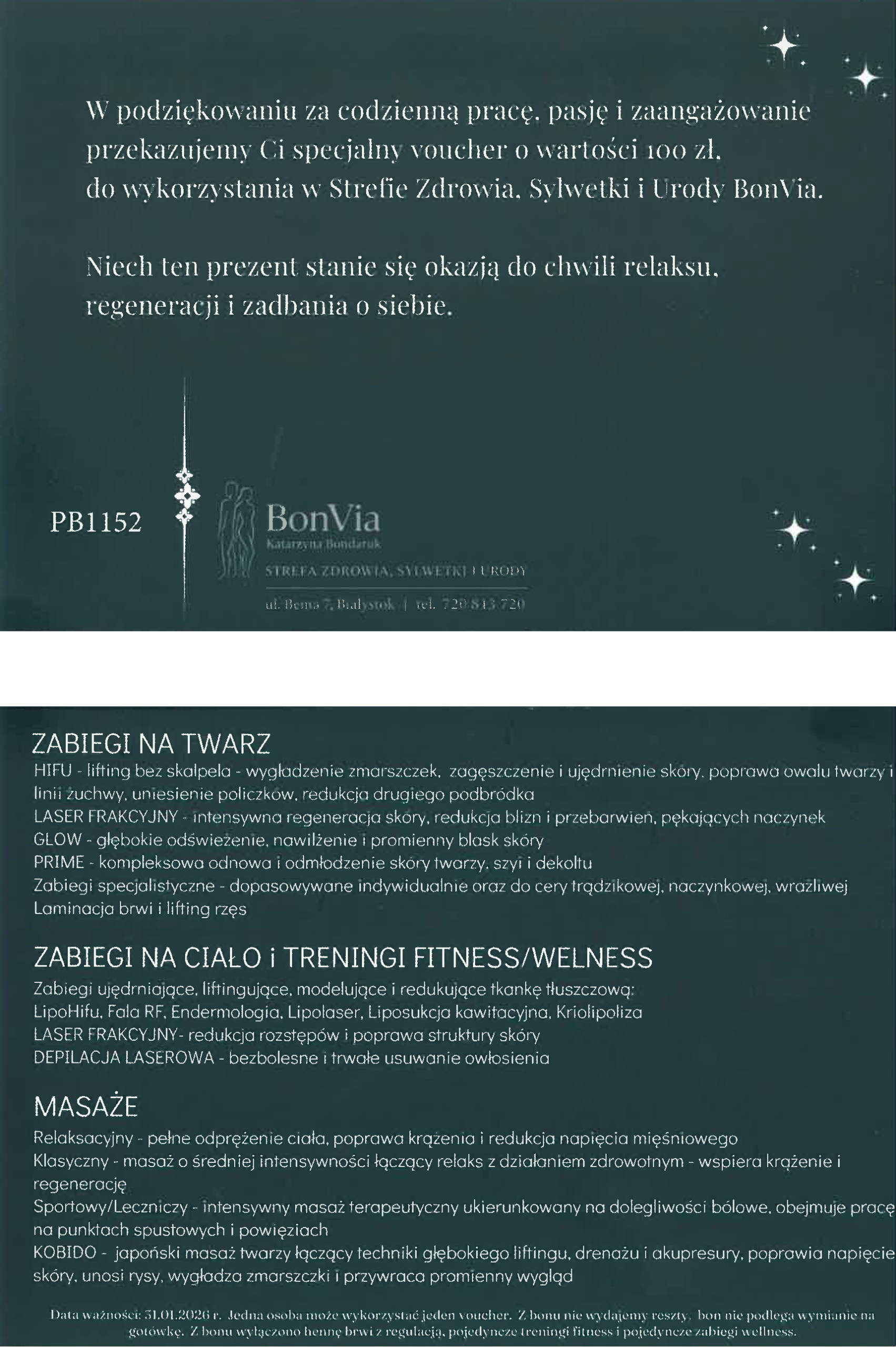 Ważność voucherów upoważniających do 100 zł zniżki na zabiegi w Strefie Zdrowia, Sylwetki i Urody Bon Via, które pracownicy Politechniki Białostockiej otrzymali z okazji Świąt Bożego Narodzenia została przedłużona do 15 marca 2026 roku.