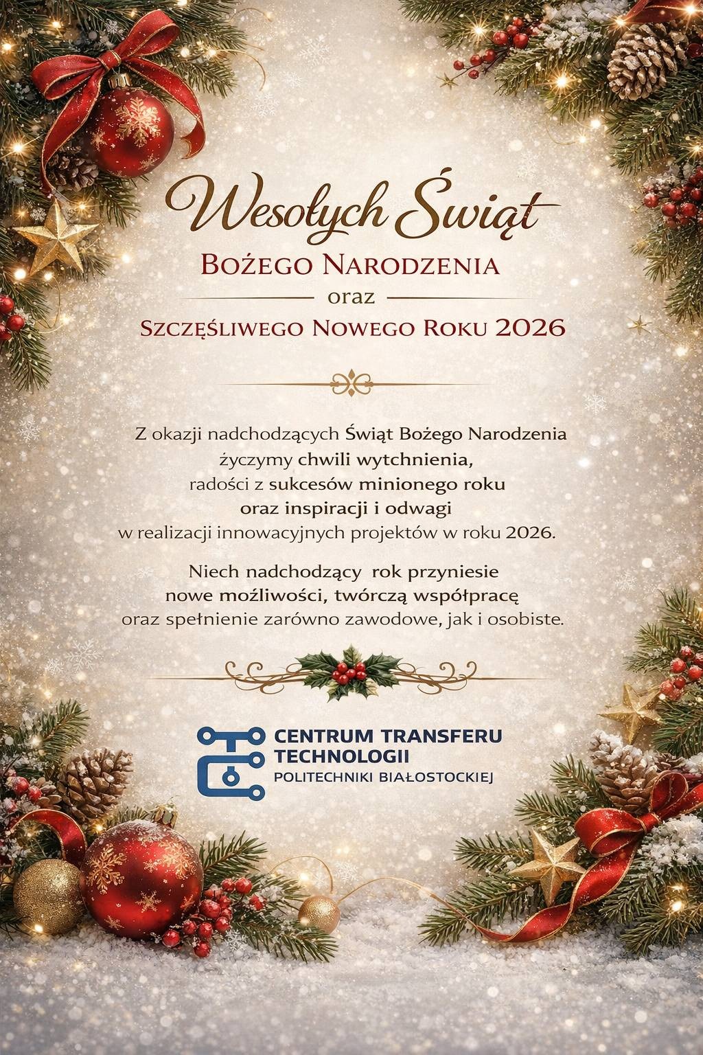 Najlepsze życzenia na Boże Narodzenie i Nowy Rok od całego zespołu Centrum Transferu Technologii PB. Oby innowacje pozwoliły nam dostrzec potrzebę dobroci, a nowe pomysły ubarwiały każdy dzień nadchodzącego roku.