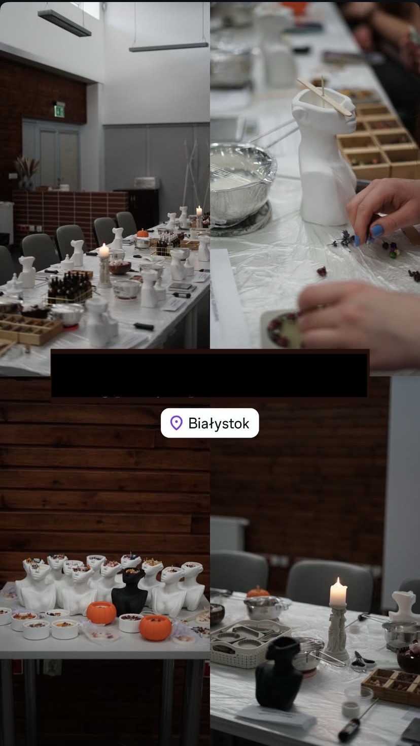 Podczas spotkania uczestnicy mieli okazję wziąć udział w twórczych zajęciach, w trakcie których samodzielnie przygotowywali dekoracyjne świece oraz kompozycje zapachowe. Warsztaty miały charakter praktyczny – każdy z uczestników mógł eksperymentować z różnymi formami, dodatkami oraz aromatami, tworząc unikalne, personalizowane projekty.