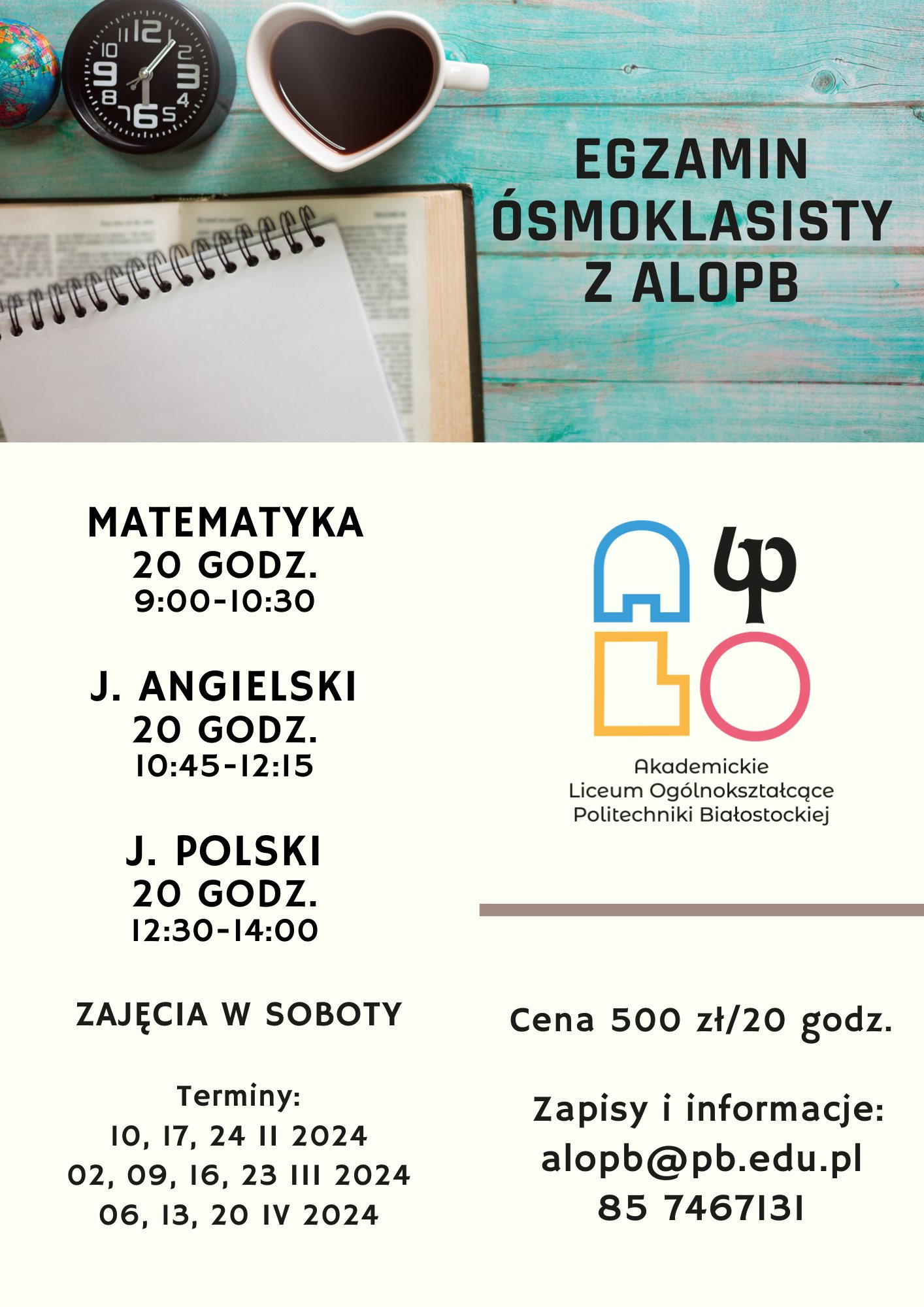 Zapraszamy na kursy przygotowujące do Egzaminu Ósmoklasisty. Zajęcia prowadzą doświadczeni nauczyciele ALOPB. Zajęcia odbywają się w siedzibie Liceum ul. Wiejska 45A.