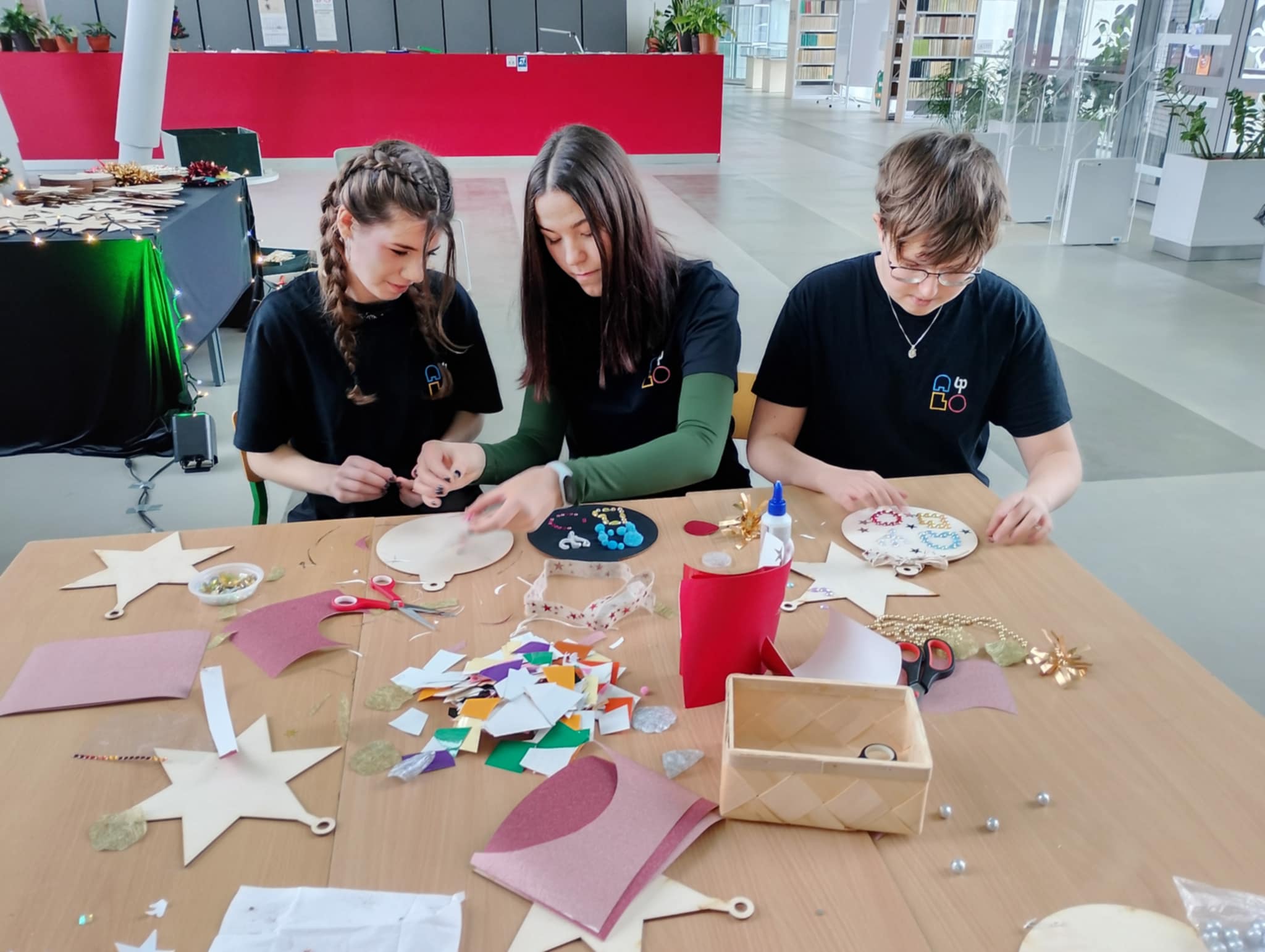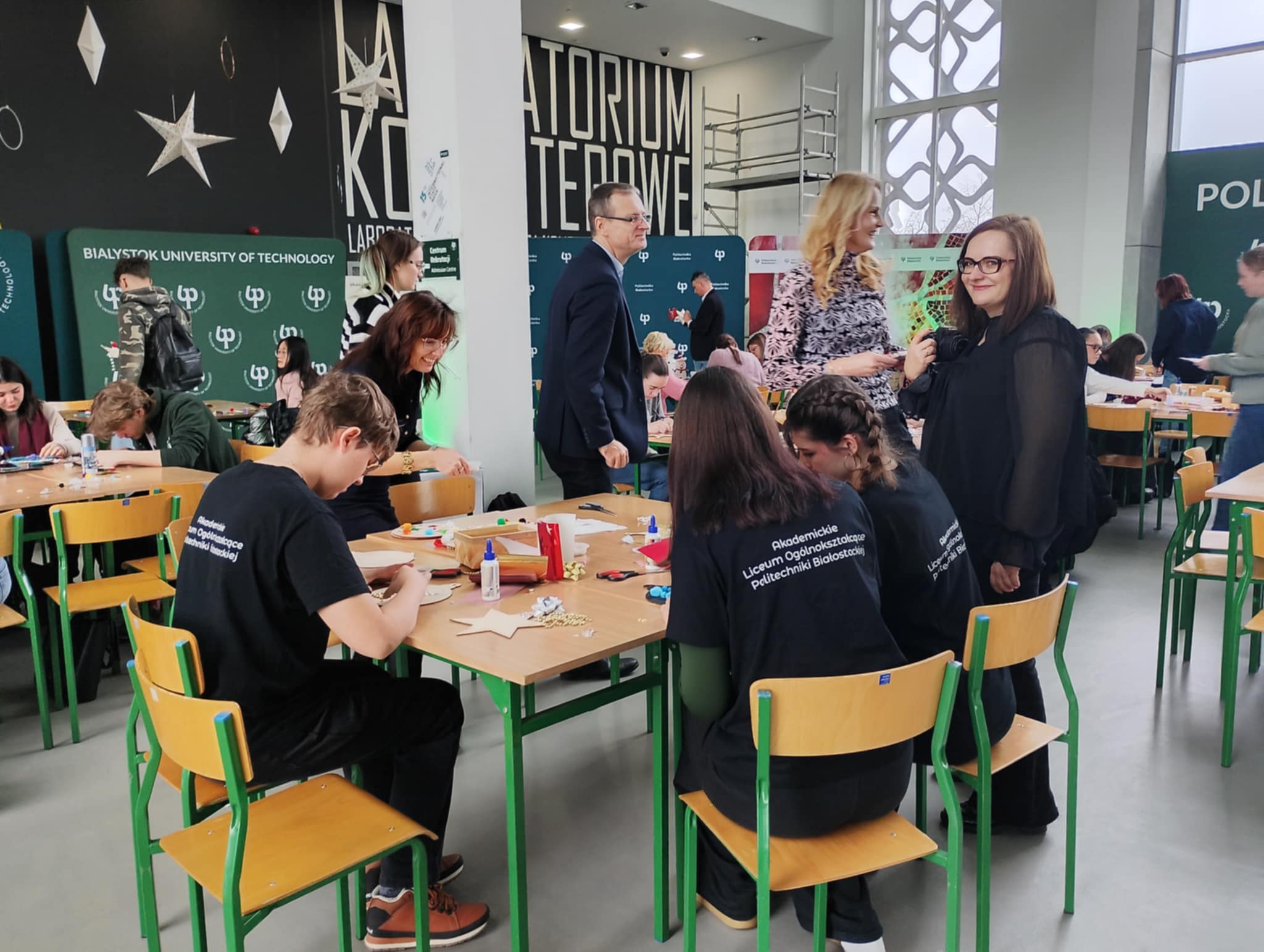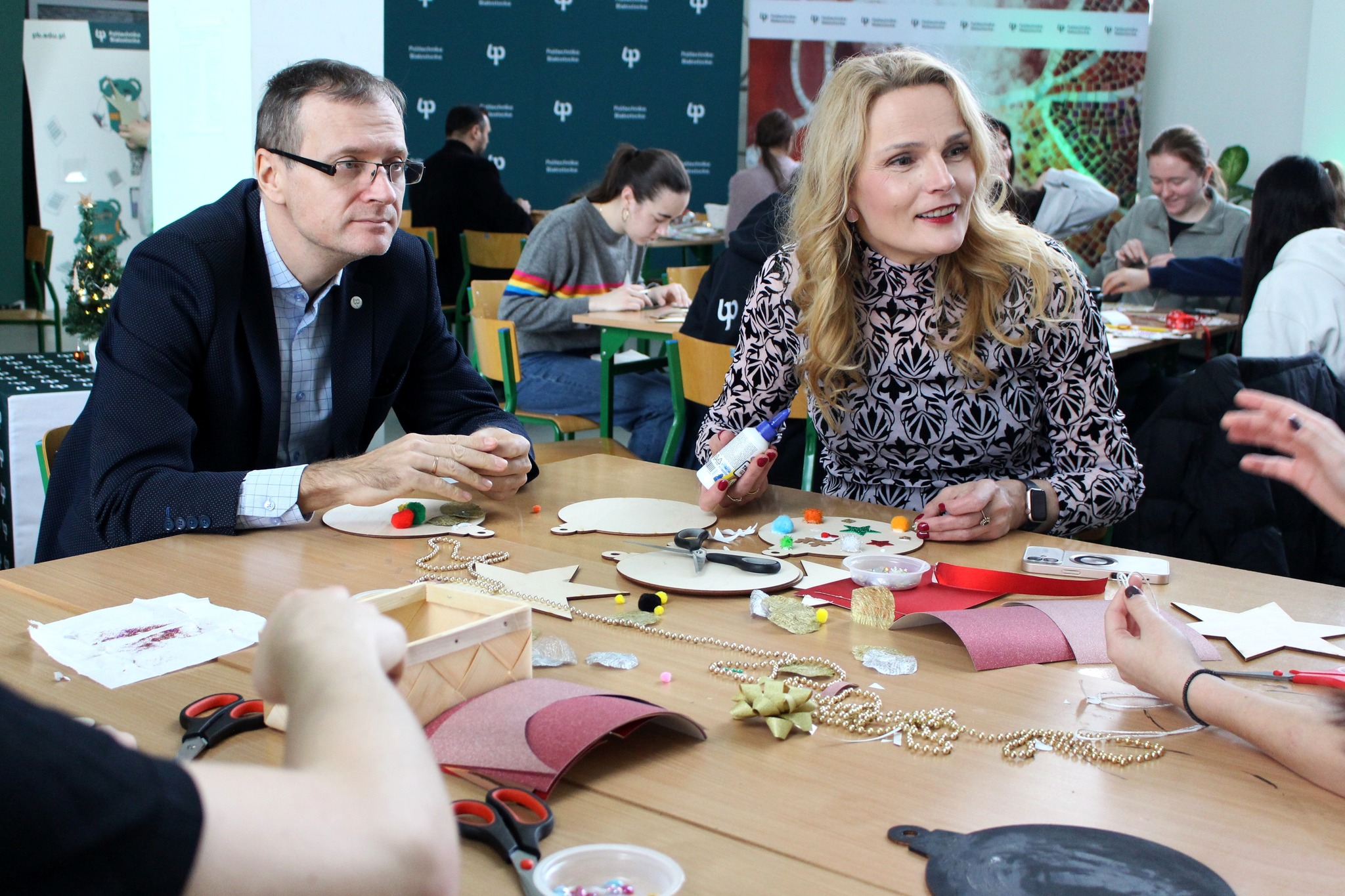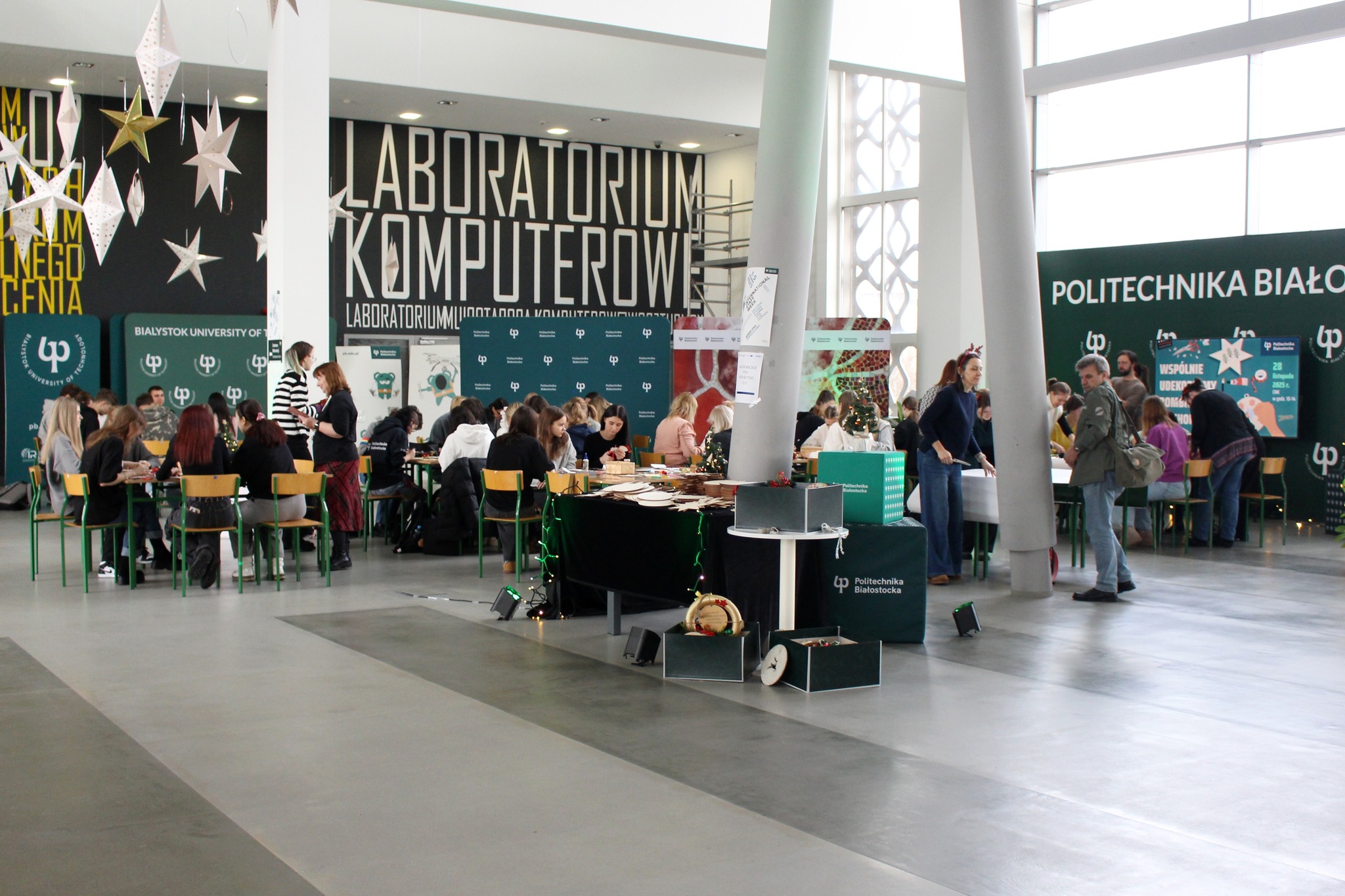 Coraz bliżej święta. Pracownicy i studenci Politechniki Białostockiej wspólnie dekorowali bombki na politechniczną choinkę w Centrum Nowoczesnego Kształcenia. Będą je zawieszać na kampusie w dniach 1- 3 grudnia 2025 r.