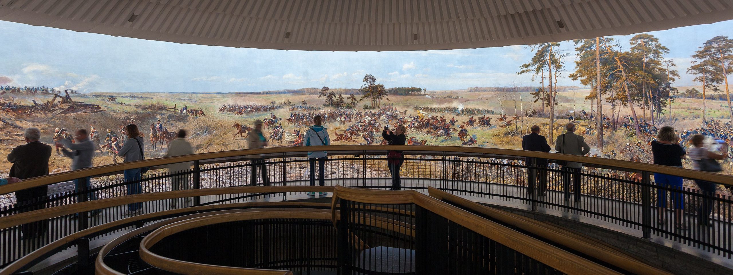 The painting is hung on the wall of a circular gallery, and the viewers move on the platform. The play of lights and other special effects, added cannons, bushes and stones, all create a wonderful three-dimensional effect.