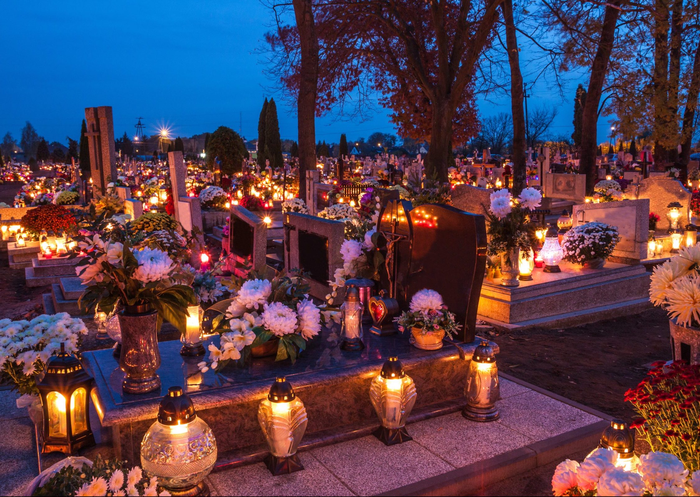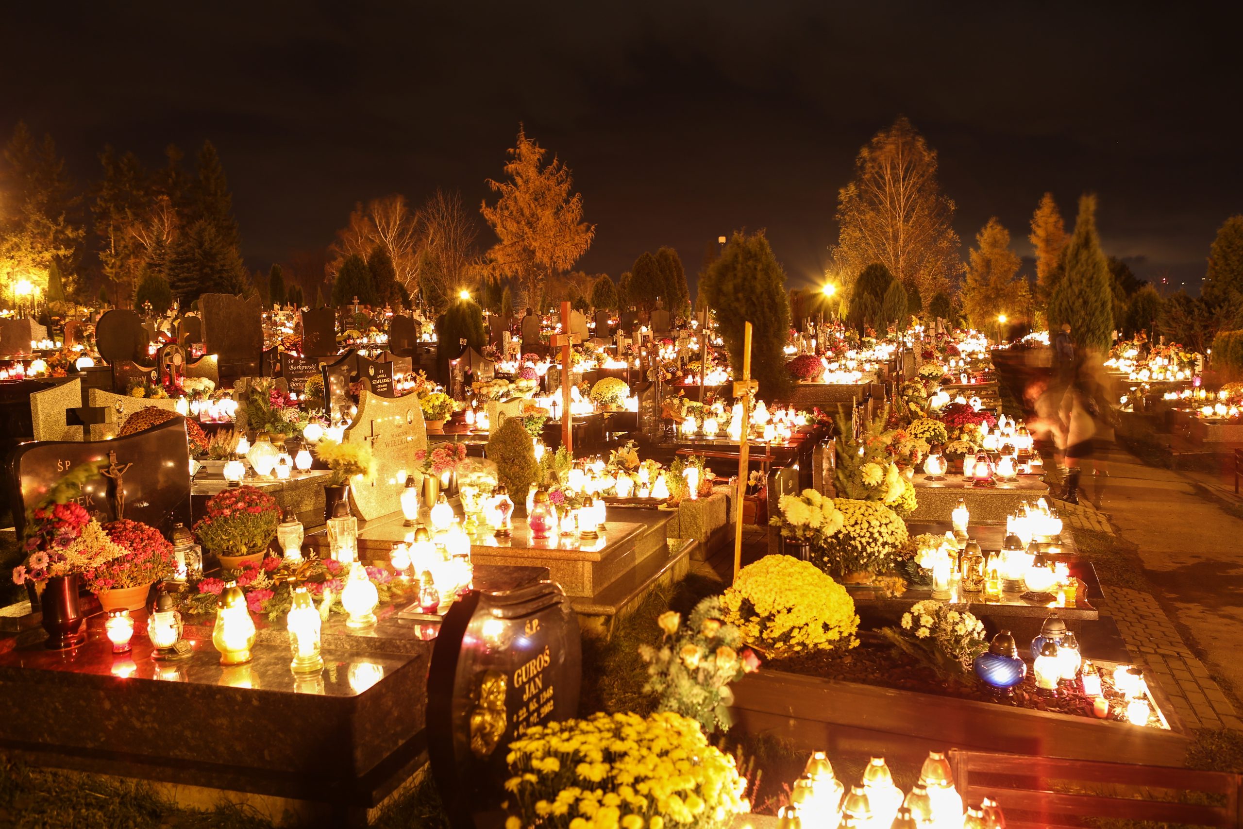 Tego dnia polskie cmentarze wyglądają niezwykle pięknie i kolorowo, zwłaszcza o zmroku, kiedy to tysiące światełek rozświetlają wieczór, a w ich świetle mienią się różnymi barwami kwiaty i wieńce.