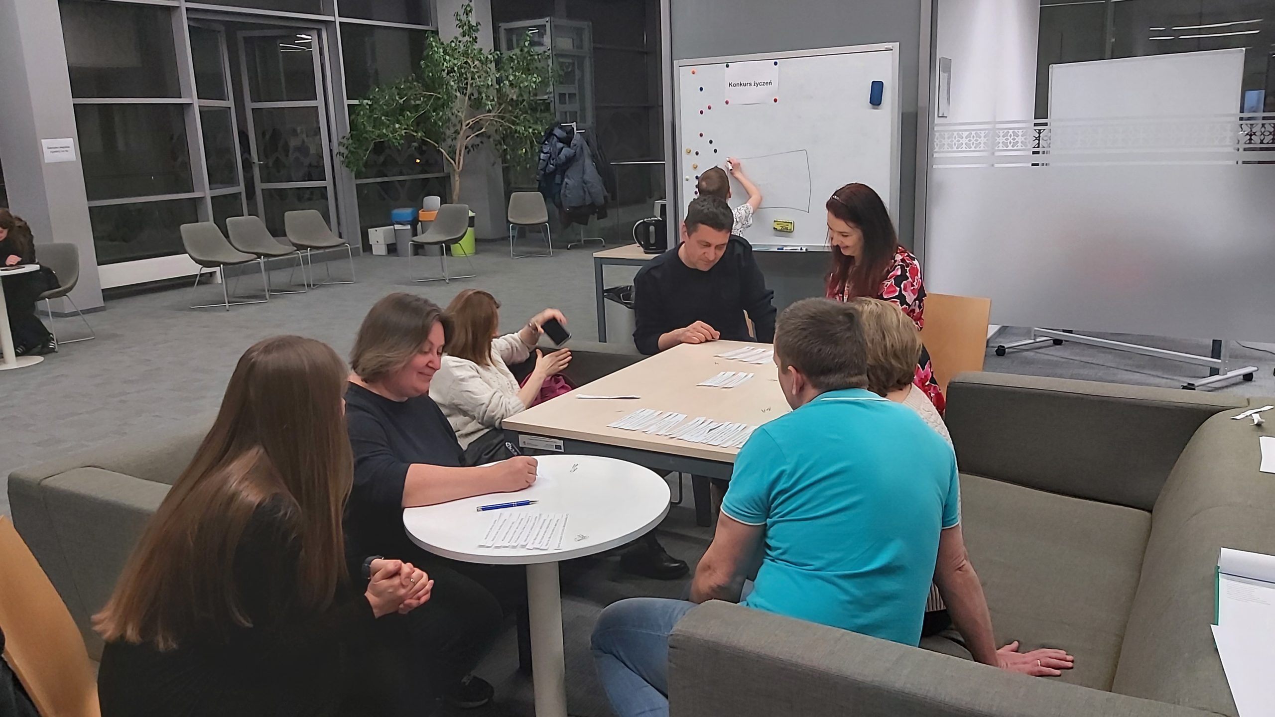 Wydarzenie rozpoczęliśmy od przygotowania wyjątkowych życzeń. Były wiersze, rymowanki, wiele życzliwych słów, bez których nie sposób wyrazić naszego uznania wobec innych, szczególnie kobiet. Uczestnicy mieli również okazję napisać własne życzenia, które wzięły udział w konkursie. Komisja konkursowa wyłoniła najlepsze życzenia pod kątem zasad poprawnej pisowni oraz niebywałej, wzruszającej treści. Nagrodę główną otrzymała Pani Larysa, pozostali uczestnicy otrzymali nagrody pocieszenia.