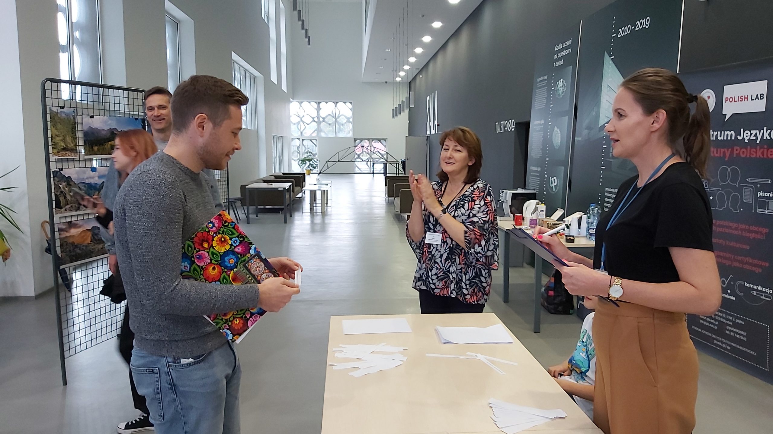 W minioną sobotę, poza otwarciem wystawy zdjęć, zaprosiliśmy uczestników do kawiarenki językowej, na warsztaty kulturowe oraz do konkursu finałowego.W kawiarence można było porozmawiać z naszymi lektorami na dowolne tematy, żeby poćwiczyć znajomość języka polskiego. Krótkie warsztaty kulturowe miały formę luźnej pogadanki z prezentacją rozmaitych ciekawostek na temat naszego kraju i nas samych 🙂